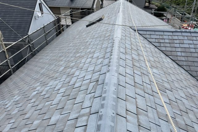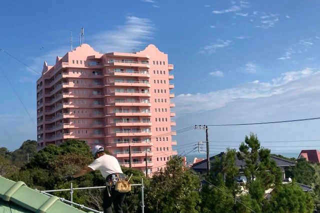 気持ちのいい秋晴れ♪ 奥に海も見えています(*^^*) 本日は棟の取り直しです。 外壁塗装は